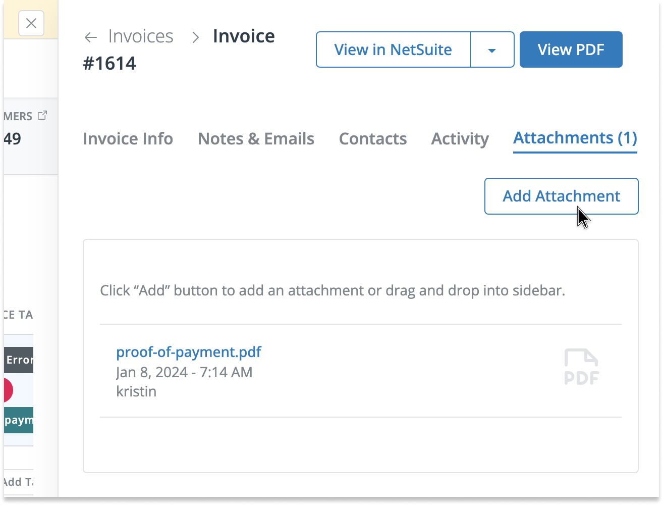 Attachments can now be added to invoice, customer, and payment records in Tesorio.