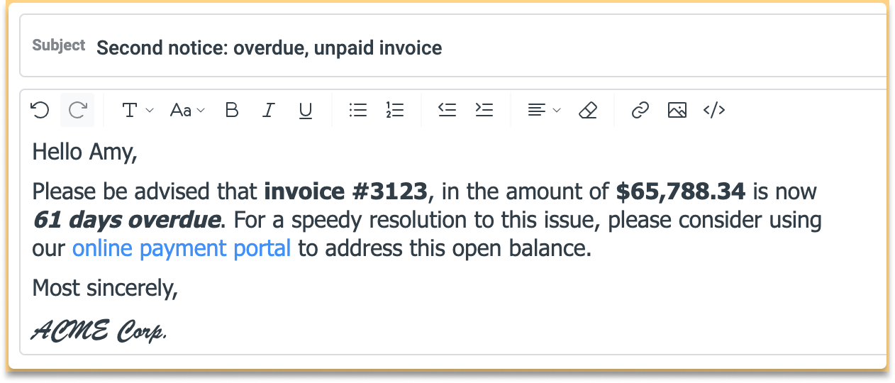 To rise above the noise in your customers’ inboxes, your emails need to stand out and communicate information quickly and concisely. And you need to do this at scale. Tesorio customers sent more than 2 million emails in 2023, with the vast majority of those sent via Campaigns. In Q4, we’ve added font selection, additional alignment options, and the ability to customize the text of variable links to the rich text editor that we introduced earlier in 2023 so that you can craft perfect emails every time.