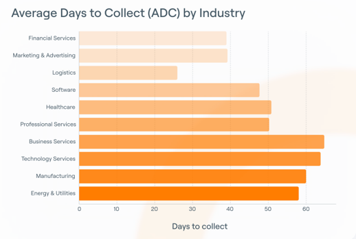 On average, software companies average 48 days to collect. Compare that to Financial Services at 39 days (best in class), Marketing & Advertising at 39 days, Manufacturing at 49 days, and Business Services at 65 days (worst).