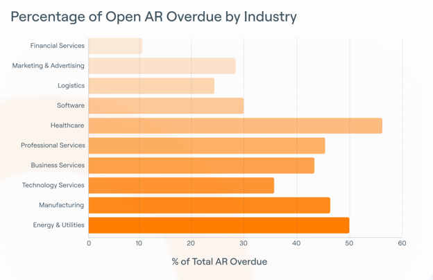 Software companies average 30% overdue rate, compared to Financial Services at 11% (best in class), Marketing & Advertising at 28%, Healthcare at 56% (worst), and Energy & Utilities at 50%.
