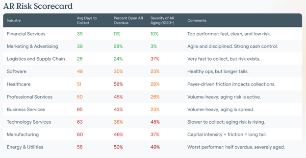 Tesorio’s 2025 AR Benchmark Report uses observed AR performance across 10 industries and includes peer-level comparisons on collection speed, overdue exposure, and long-tail severity. This is useful for understanding what “good” looks like and where risk sits.