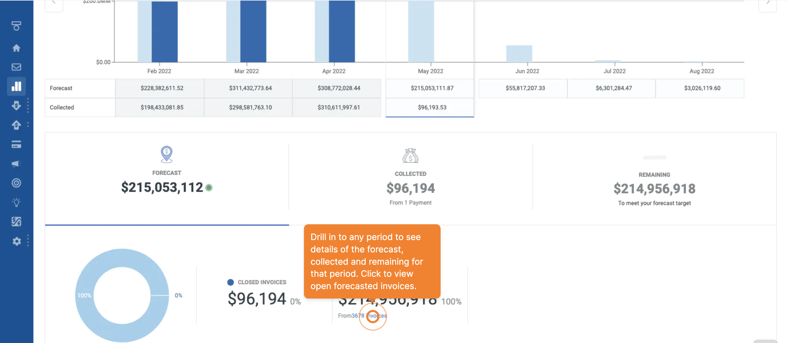 AR can track and analyze with one click, providing customized insights and drilling down into any period to compare collected and remaining. See current and future invoices in one place, identify risks early and trust your forecast when reporting to leadership.