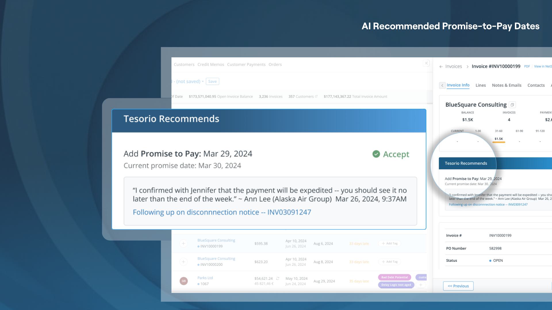 - AI Promise-to-Pay Date Detection: No more searching through emails for payment commitments. Tesorio’s AI extracts payment commitments hidden in emails and automatically detects promise-to-pay dates and integrates them into forecasts— improving accuracy without manual work. To date, this feature has extracted over 12,700 promise-to-pay dates with a 90% acceptance rate, reducing uncertainty and streamlining collections.