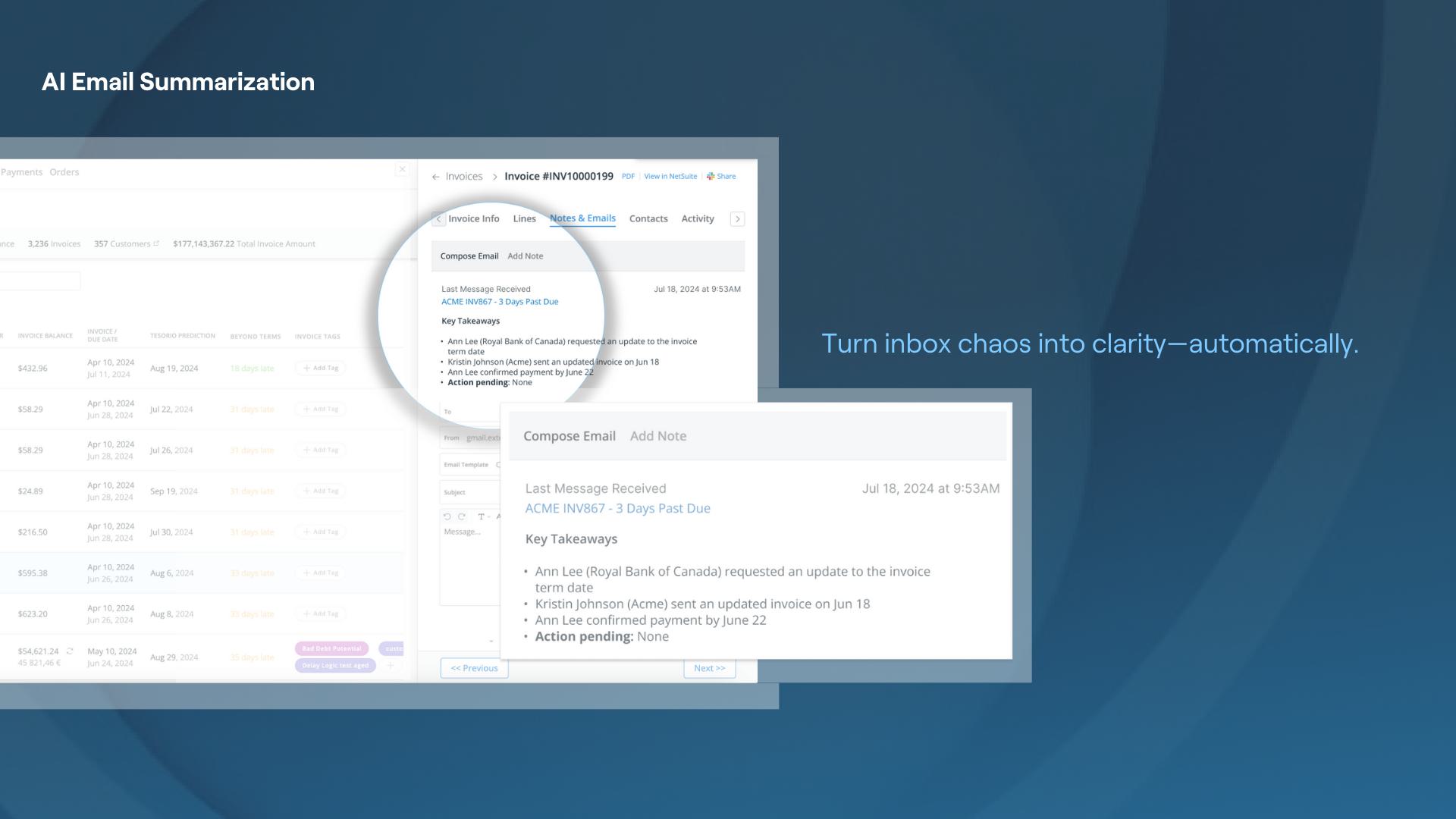 - AI Email Summaries: Stop sifting through email threads. Tesorio’s AI instantly summarizes customer messages, invoices, and billing updates—so teams can focus on action instead of inbox management.